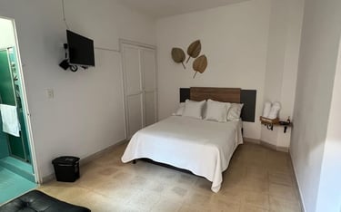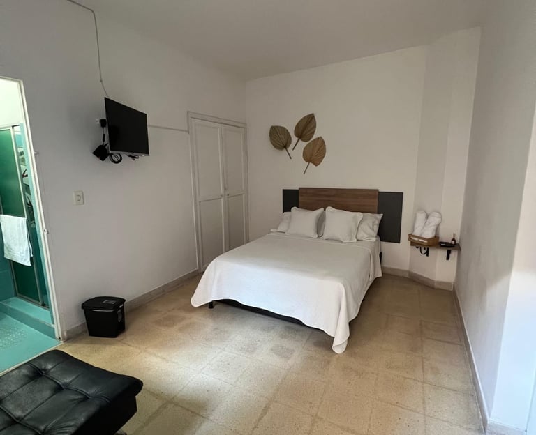 Espaciosa habitación doble con cama doble, perfecta para parejas o viajeros que buscan un ambiente tranquilo para un descanso reparador, ideal para tu estancia en Medellín.