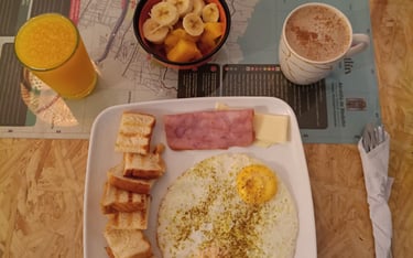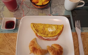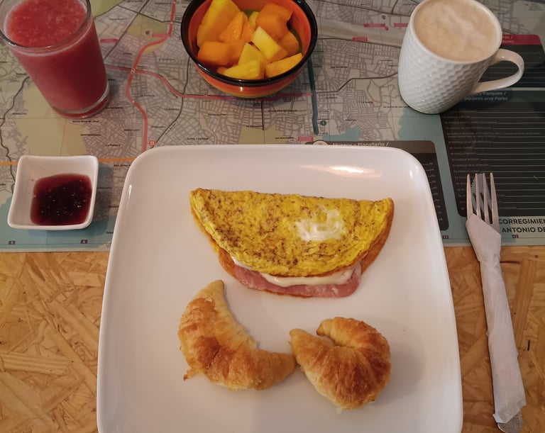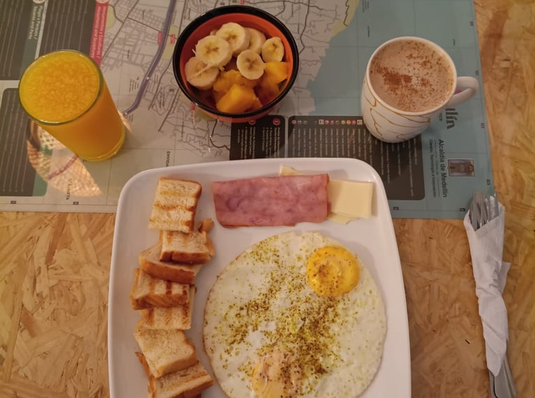 Empieza tu día en Medellín con un desayuno fresco y lleno de sabor. Disfruta de nuestras tres opciones: Vegano, Vegetariano y tradicional. Incluye frutas tropicales, café colombiano recién preparado, proteina, pan o croissant; ideal para compartir y comenzar la mañana con buena vibra.